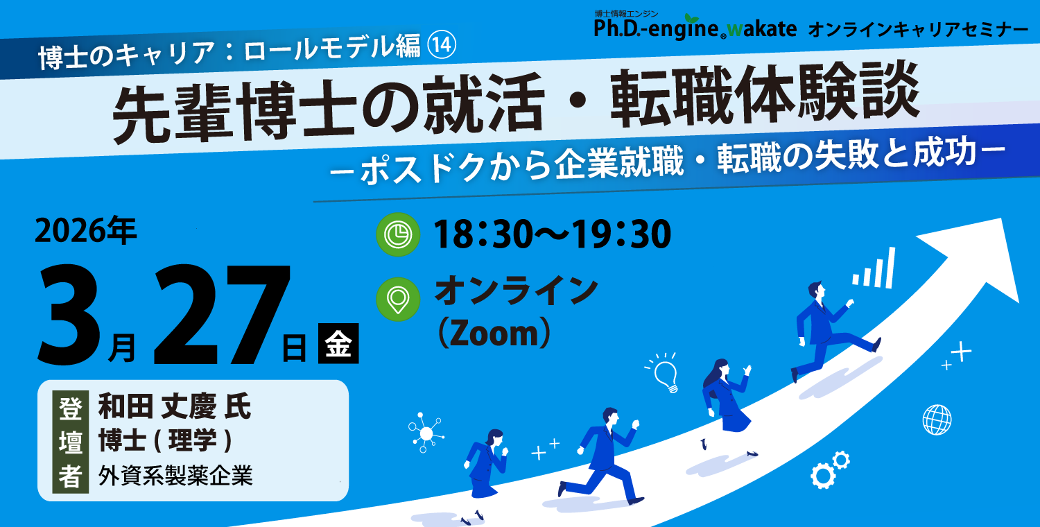 博士情報エンジンwakate オンラインキャリアセミナー【博士のキャリア:ロールモデル編⑭先輩博士の就活・転職体験談】ポスドクから企業就職・転職の失敗と成功